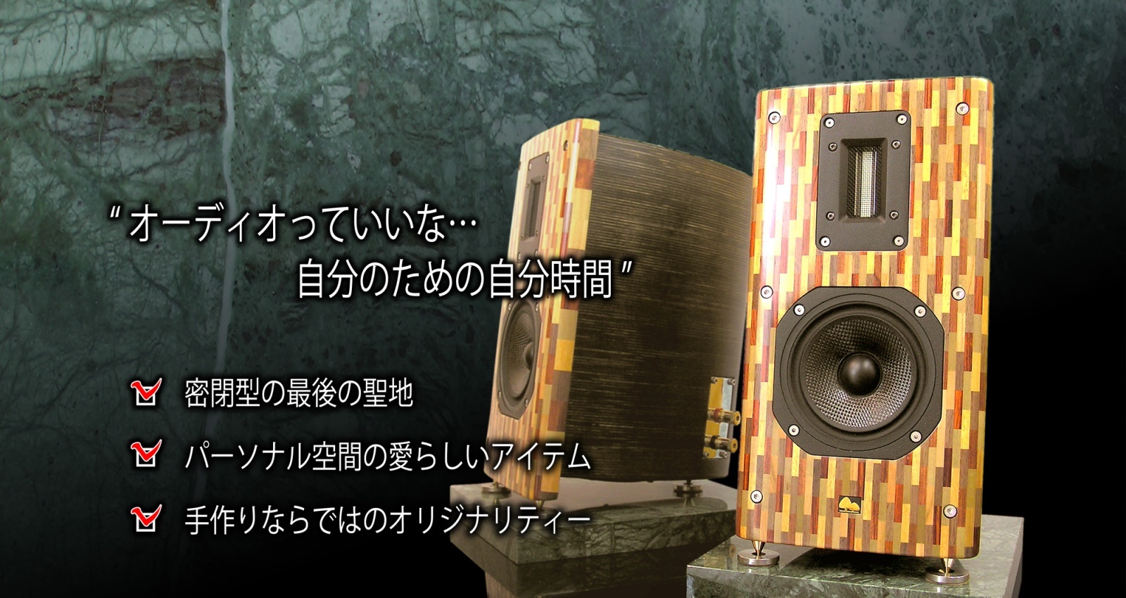 私たち独自の寄木細工スピーカーや、天然銘木材を活かしたスピーカーなど、市場にはあまり無いスピーカーを取りそろえております。