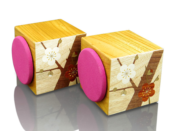 量産品としては初めての物だと思います。象嵌の歴史は古く、遥かペルシャの方から伝わり、日本では飛鳥時代からの歴史が有る様です。箱根寄木細工の技法として、現在でも小田原箱根界隈では受け継がれている技術ではありますが、現在国内でも数名の象嵌師しか居らず、通常は額装にして販売されているものを贅沢に4面使ってスピーカーに仕立てました。
