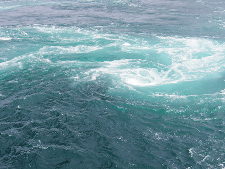 おの一部で、島側から観光船で渦潮を見てきました。1日の中でも満潮と干潮の時間帯のみ、更には潮の関係か大渦になる日が決まっていて、その日と時間でなければ殆ど見れません。こちらの都合と海の都合をどうにか合わせ、時間帯も午前中の干潮時間にまで絞り込み、ようやく見れたのが写真の様な渦潮です。