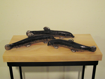 「アマゾンの秘境」 これが今回最大の大作。丸い魚の直径が80cm程度。太さ1m以上の丸太を輪切りにして、掘り出した作品。ブルーは染め銀箔。