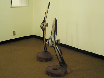 「2匹のモノダクティルス・セーベ」 大きさ:高さが大きい方で90cm程度。材質はクスの木、銀箔の上に塗装。