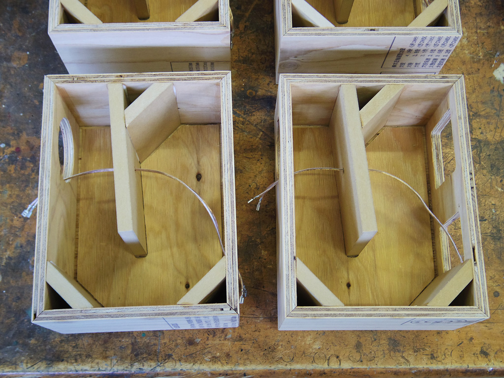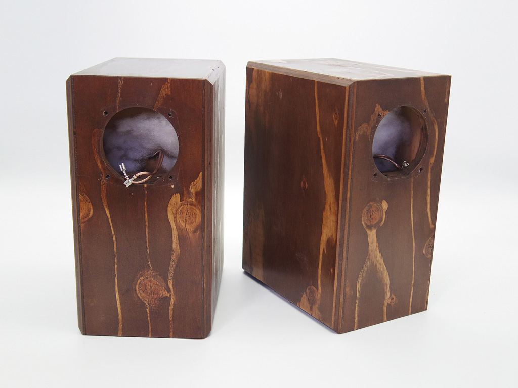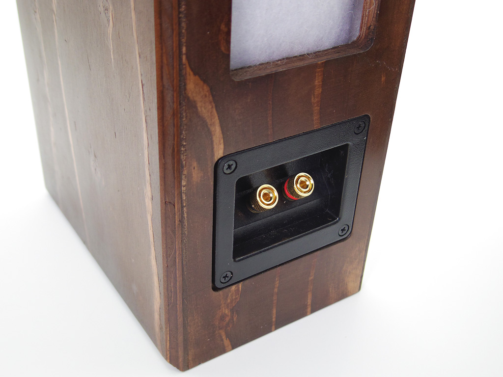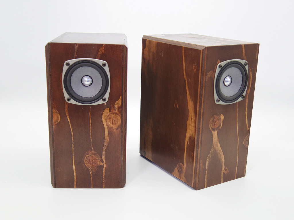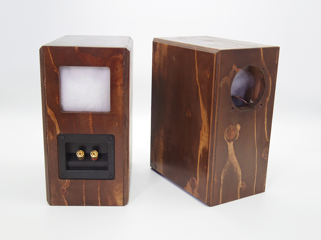素材は針葉樹系の合板を採用。昔、ユニットが非力な時代、エンクロージャーを響かせ豊かな音作りをした製品がありましたが、箱鳴りが止まらずそのコントロールがかなり難しいのが欠点です。その為、箱を大型化し共振音を低域に持って来て聴かせるタイプが多く、この方式の殆どが大型フロアタイプの物ばかりでした。それをあえてA4サイズまで小さくし、響きの良い針葉樹系の合板を用い、ユニット選びや吸音材のチョイス、量、あるいは塗装方法など、音を調整する術が沢山あり、お客様が自由に創作できる素材提供を目指しました。