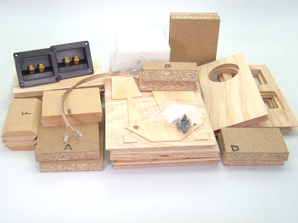 無塗装で、ばらばらな状態です。木工ボインドを使って一枚づつ組み立てるKITになりますスピーカーユニットは付属していません。9cmのユニットも使用可能ですが、穴の大きさを変更するなど特別な加工が必要です。それらの加工も皆様で楽しんで取り組んでください。入手が難しいユニット等は別途ご相談下さい。
