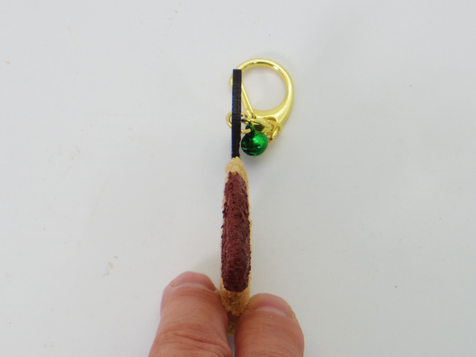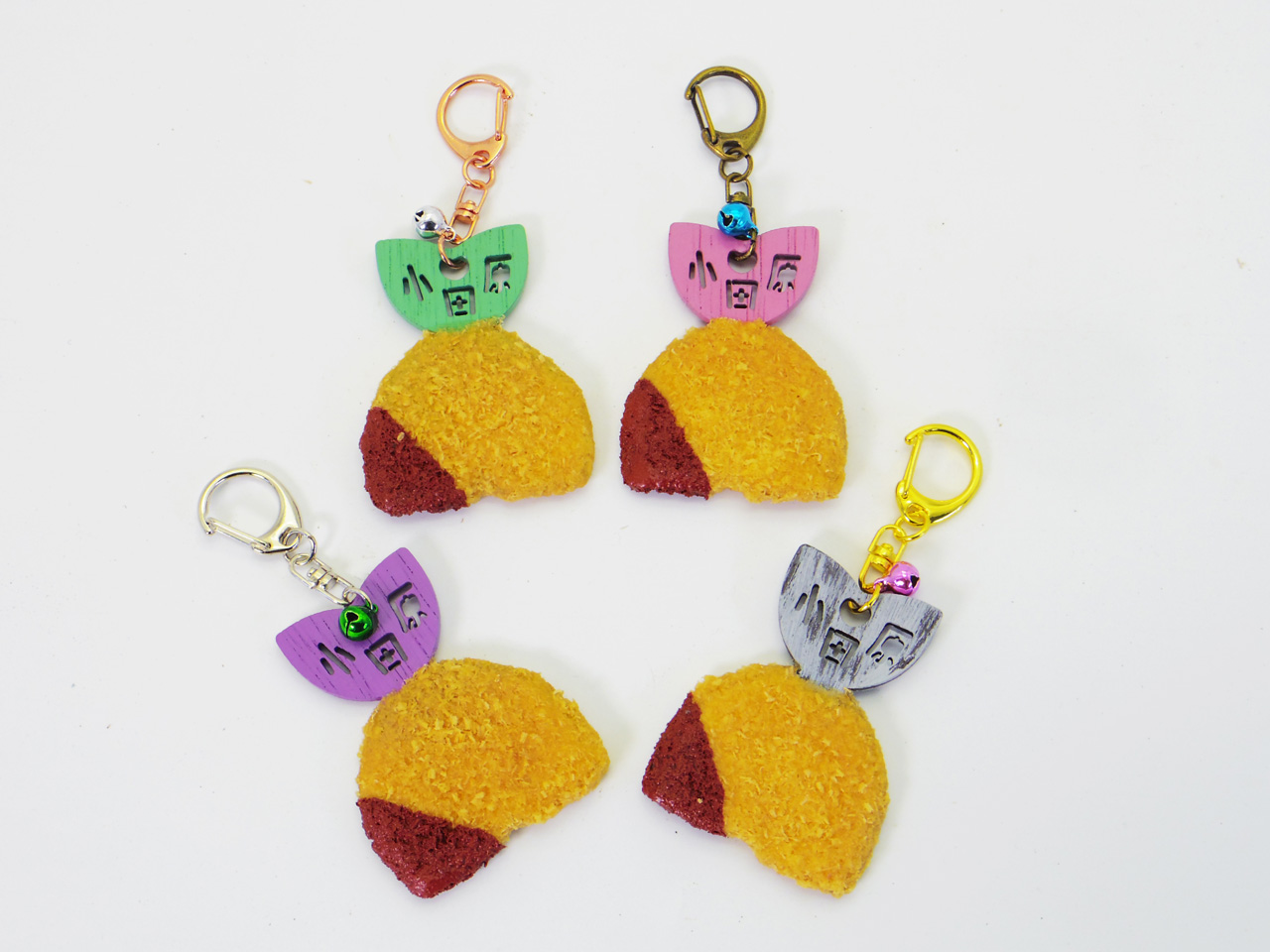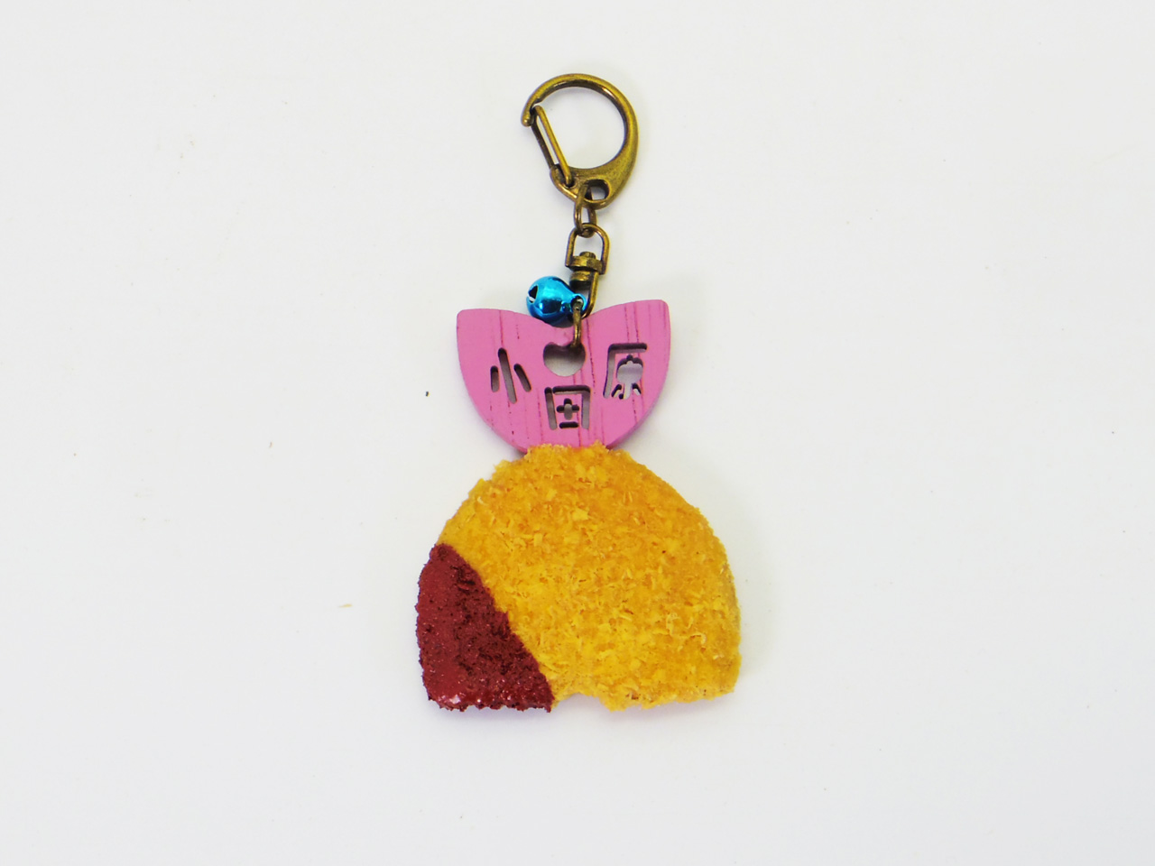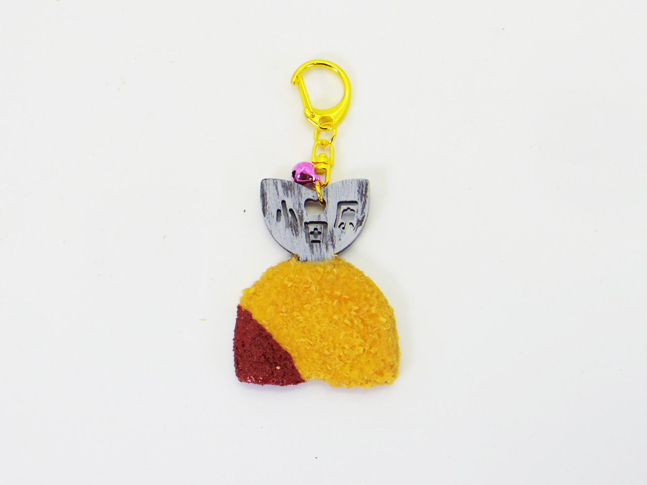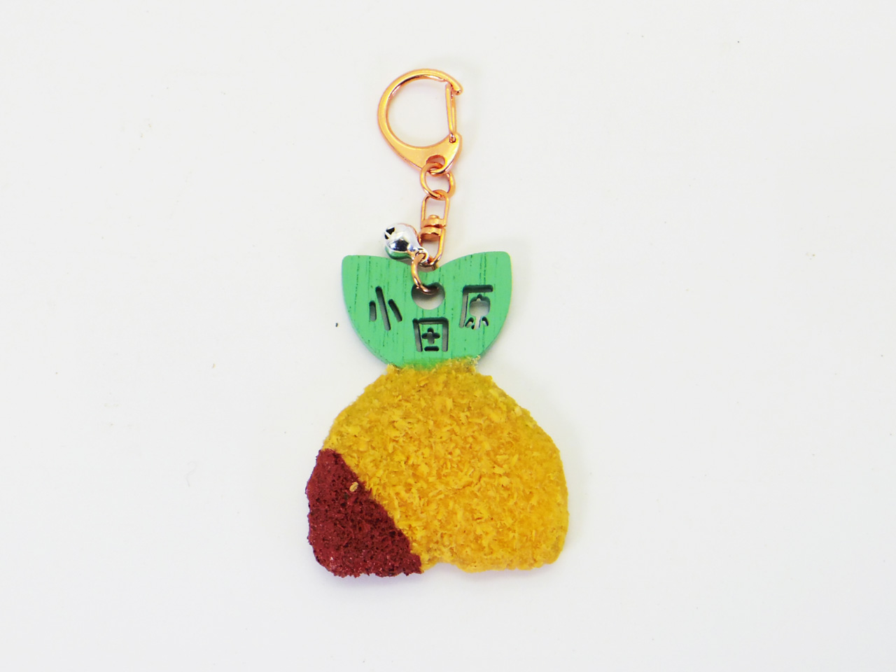 パン粉に当たる粉はヒノキを使用し、下部にソースが付いた状態を再現し、キーホルダーとしても使える金具を採用し小さな鈴で飾っています。しっぽの文字は伐り抜き加工で表現しています。